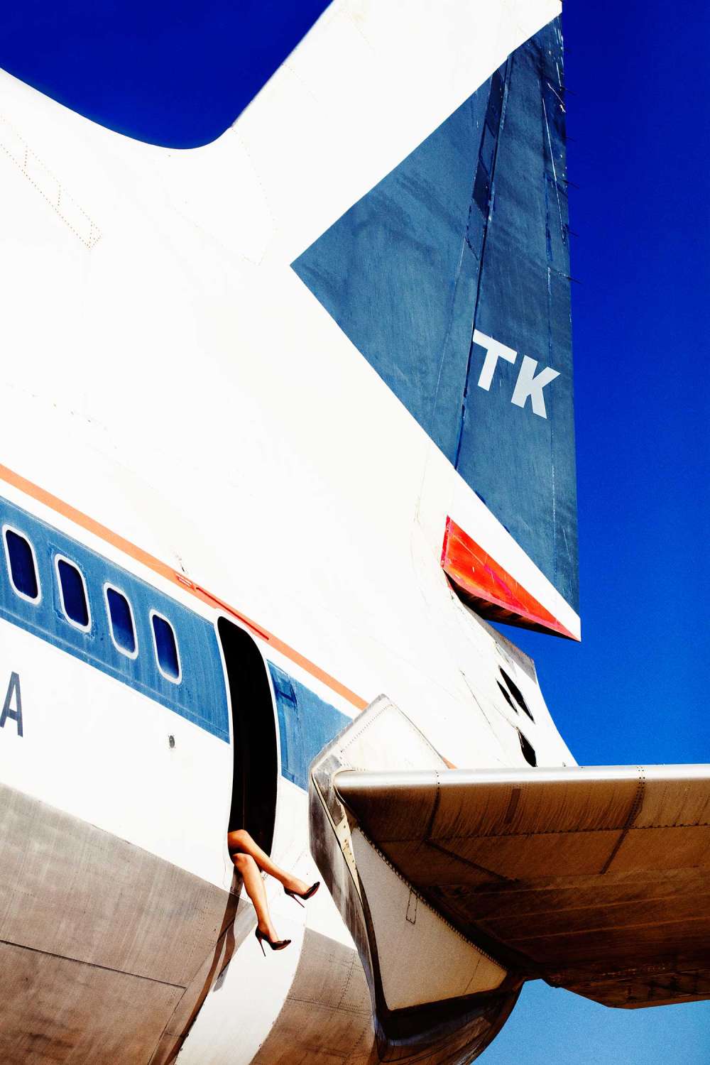 Everyone needs a soft landing when airing out your Loubs during a stopover. Oversized equipment (even on Flight TK) is no match for her stems in this play on concept of scale and visual power.